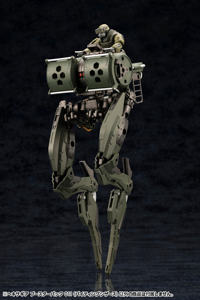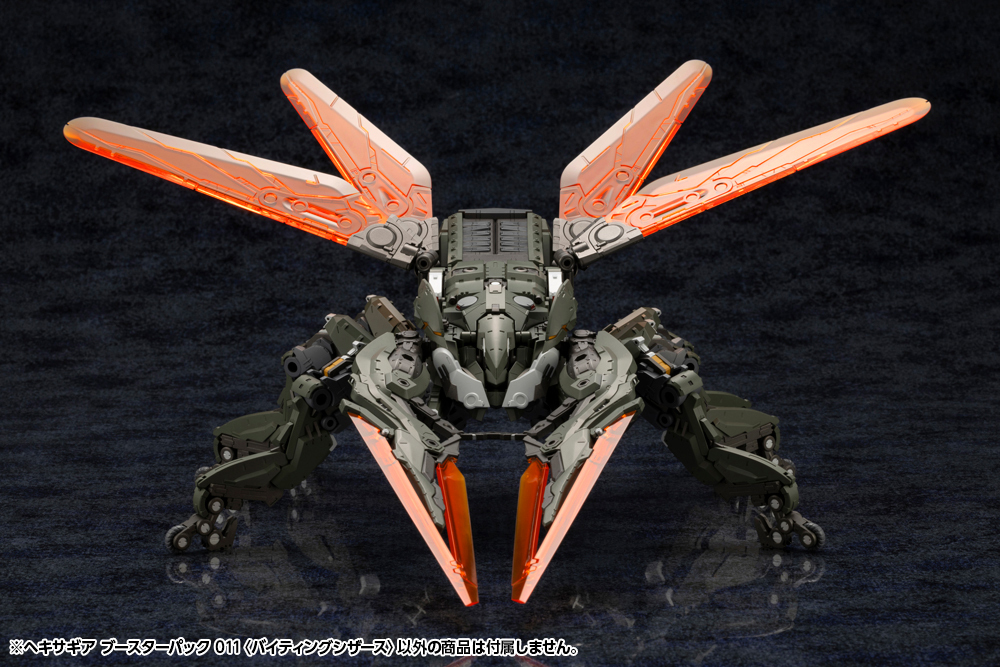 ブースターパック第11弾は甲虫の大顎から挟脚、剣、翼、脚部にと汎用性の高いデザインが特徴の武装ユニットです。成型色はシリーズ内で共通カラーの多いヘキサギアダークグリーンとなっており、ブースターパック007、008、012、013と組み合わせる事で大型格闘用ヘキサギア「ゲルトルード」のダークグリーン仕様を組み立てる事が出来ます。