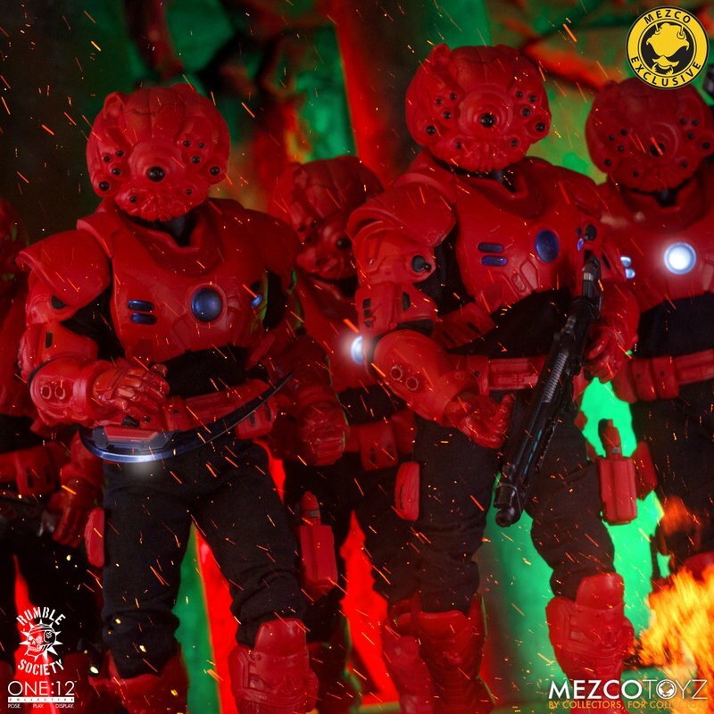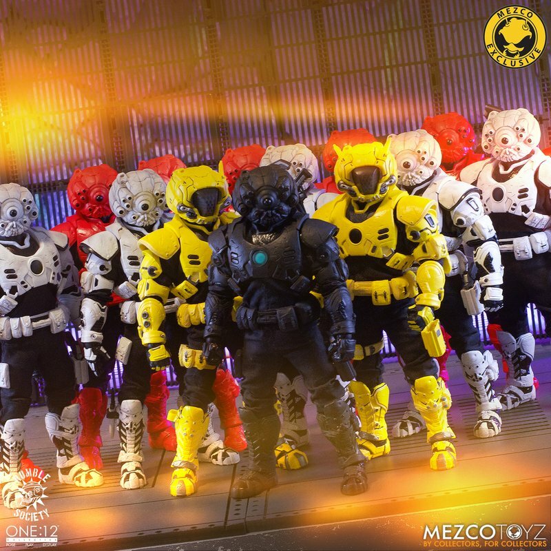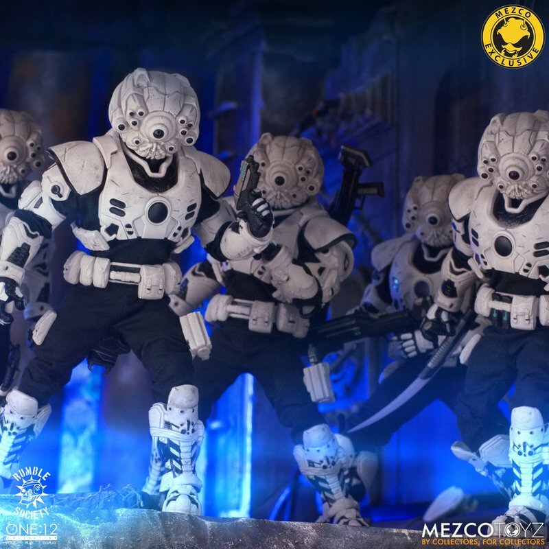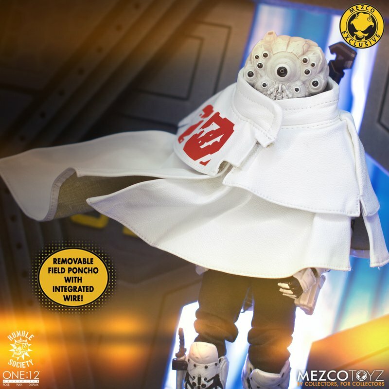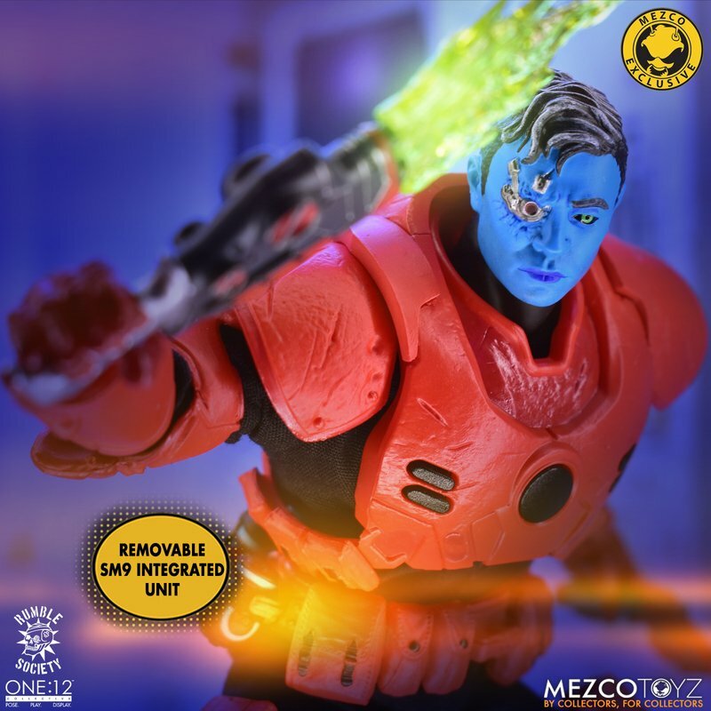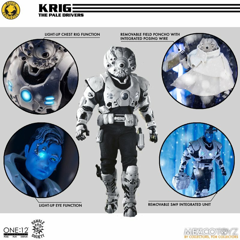 The One:12 Collective Assault on Krig-13: Squadron Army Builder Set includes two Krig soldiers, one Blood Force and one Pale Driver. The Krig come wearing standard-issue armor which features a light up function in the chest rig. Their armor is built for battle, consisting of a duty belt, thigh holster for their Side Blaster, weapon bracket on their back, and terrain boots. The SM9 Integrated Unit fits securely over their head portrait with a light-up tech-eye. The removable Field Poncho with integrated posing wire can be customized with the included sticker sheet.
