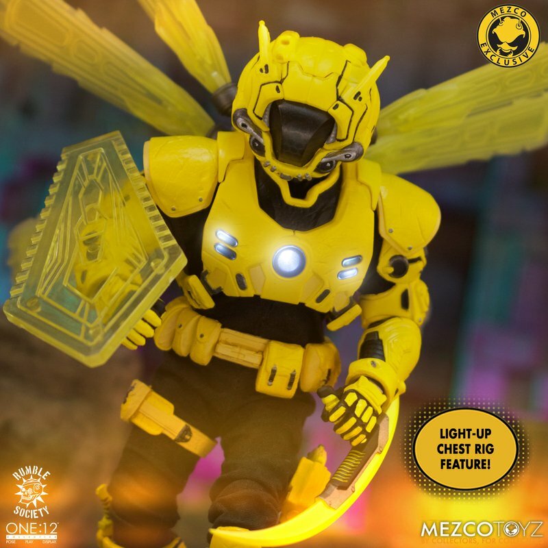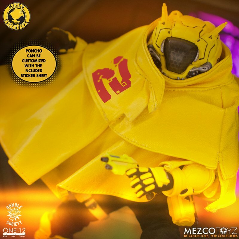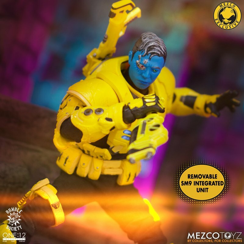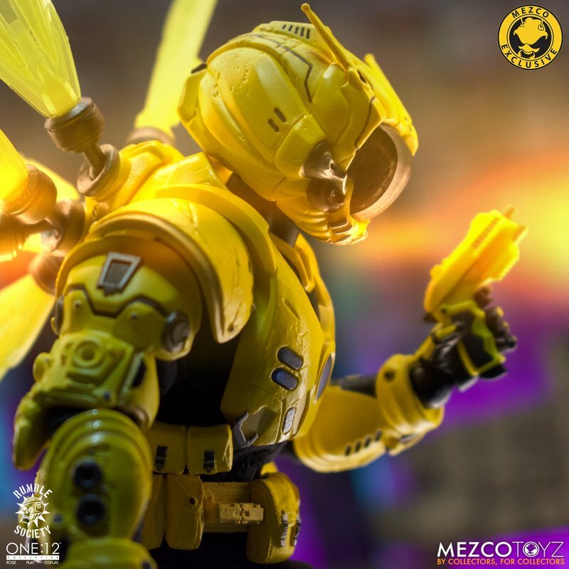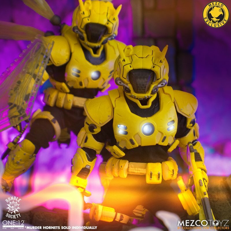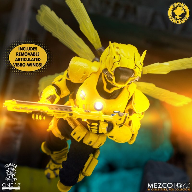 The One:12 Collective Krig wears Murder Hornet armor with removable Vibro-Wings, lightweight enough to maneuver in flight and strong enough resist the extreme conditions of various atmospheres. Their armor consists of a chest rig with light-up function, duty belt, thigh holster for their Side Blaster, and terrain boots. The SM9 Integrated Unit fits securely over their head portrait with a light-up tech-eye. The removable Field Poncho with integrated posing wire can be customized with the included sticker sheet.