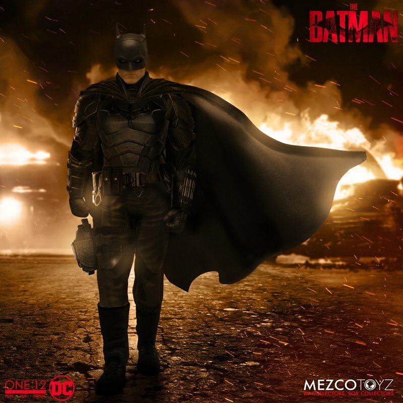 The Batman is outfitted in a screen-accurate armored Batsuit with chest insignia. The costume features an integrated posing wire in the cape, utility belt, a thigh pouch, and two vambrace. Batman comes complete with four head portraits including an unmasked Bruce Wayne portrait, all featuring the likeness of actor Robert Pattinson.